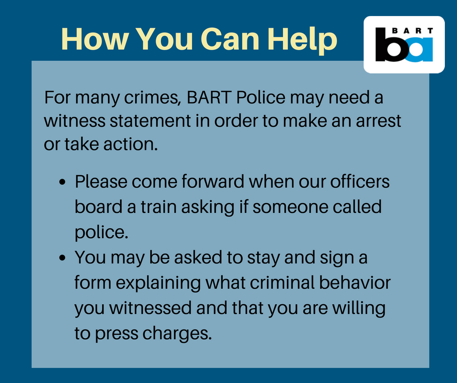 For many crimes, BART Police may need a witness statement in order to make an arrest or take action if our officer didn't actually see the crime. That means we need you to come forward when our officers board a train asking if someone called police. We may need you to stay and sign a form explaining what criminal behavior you witnessed and that you are willing to press charges.