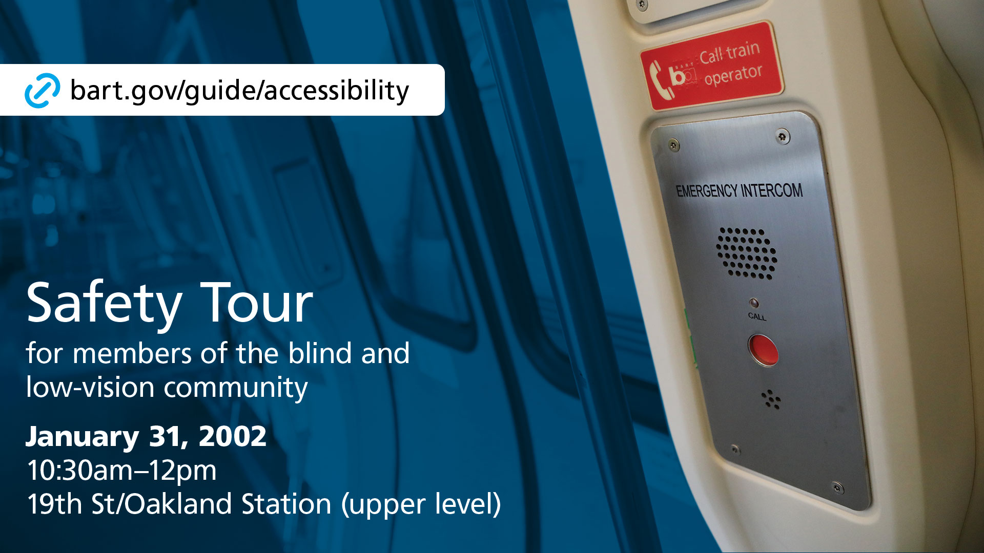 BART is also in the process of organizing an online Town Hall for the blind and low vision community to gather input on upcoming projects and to hear directly about how we can improve accessibility services. The Town Hall is tentatively set for February 28th. Time and details are still in the process of being finalized.