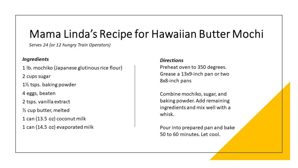 Mama Linda’s Recipe for Hawaiian Butter Mochi. Ingredients 1 lb. mochiko (Japanese glutinous rice flour) 2 cups sugar 1½ tsps. baking powder 4 eggs, beaten 2 tsps. vanilla extract ½ cup butter, melted 1 can (13.5 oz) coconut milk 1 can (14.5 oz) evaporated milk . Directions Preheat oven to 350 degrees. Grease a 13x9-inch pan or two 8x8-inch pans  Combine mochiko, sugar, and baking powder. Add remaining ingredients and mix well with a whisk.   Pour into prepared pan and bake 50 to 60 minutes. Let cool.