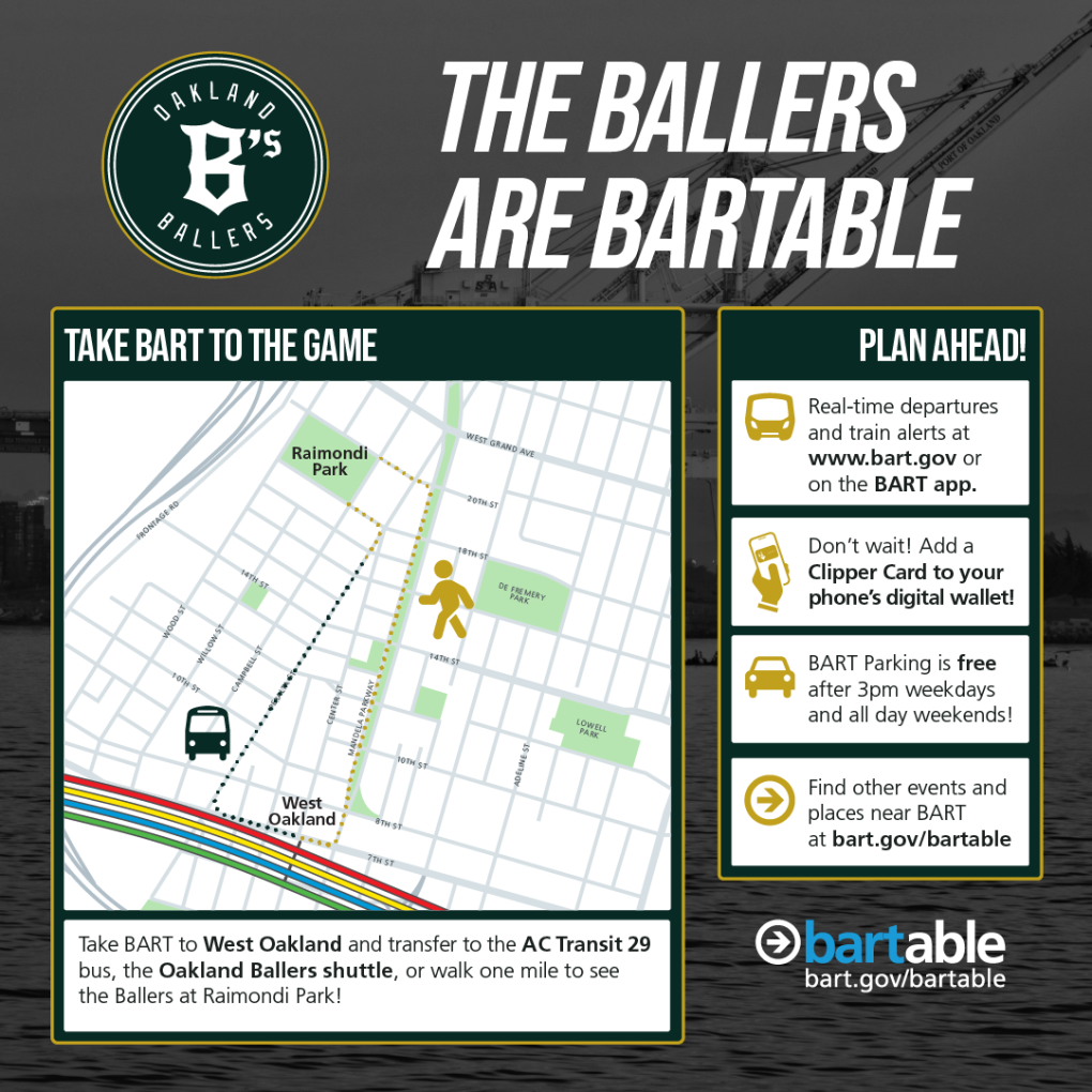 The Oakland Ballers, in partnership with Douglas Parking, will have shuttles from West Oakland BART to Campbell between 18th and 20th, running every 20 minutes starting 3 hours before game time and a half hour after the game ends