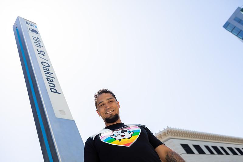BART engineer Joshua Muñoz pictured in front of 19th Street/Oakland Station in the 2024 BART Pride t-shirt.