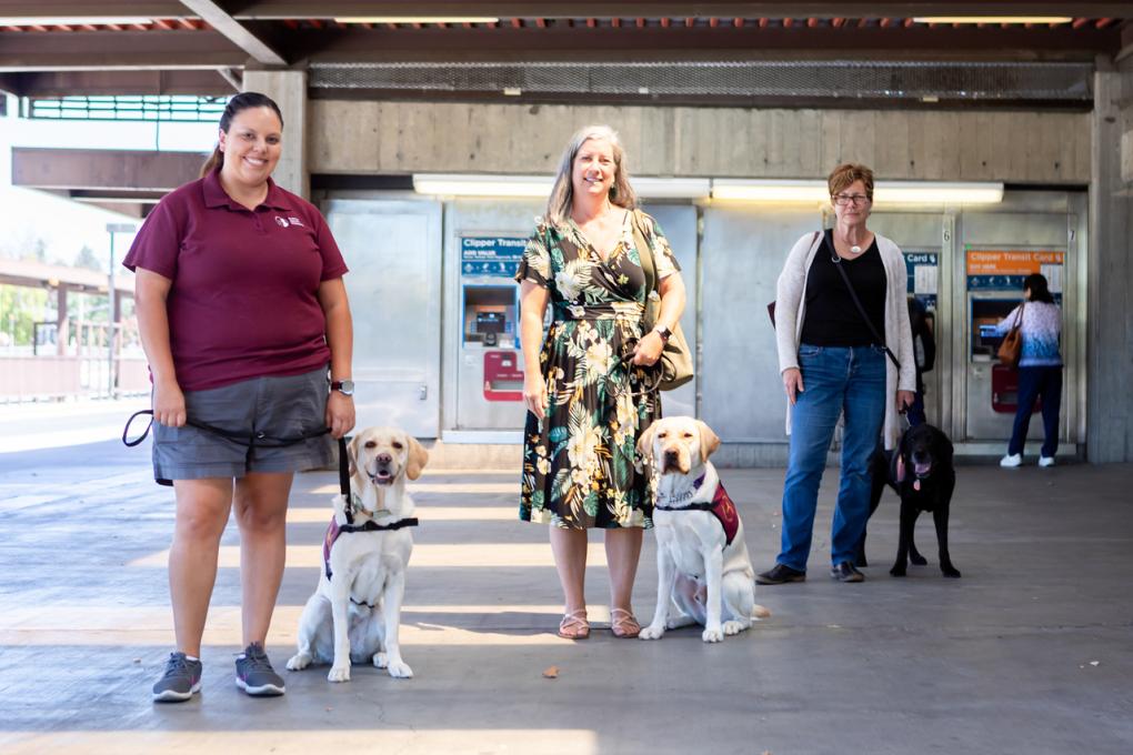 Early Alert Canines service dogs on BART, from left to right: Scarlett with handler Alysia Santos, Handsome Ransom with handler Kathleen Fraser, Sheldon with puppy trainer Suzie Scher.