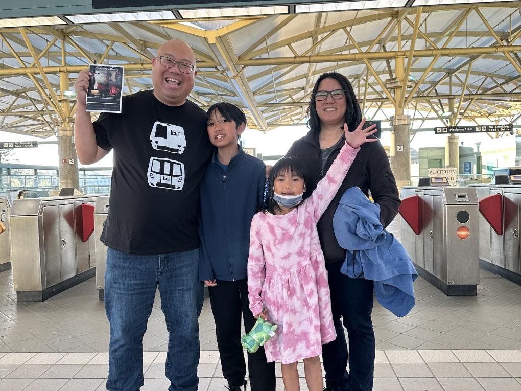 Mark Nagales and his family pose on the concourse at Millbrae Station.