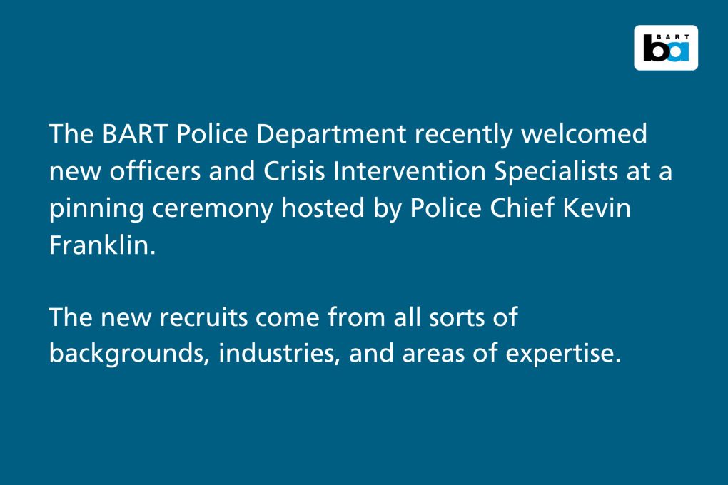 The new members of the team come from a variety of backgrounds, and we honor their unique experiences that will bolster the department’s ongoing focus on community-oriented progressive policing. The new hires included specially trained Crisis Intervention specialists, members of BART's nationally recognized Progressive Policing Bureau respond to incidents that needn’t require an armed police presence.