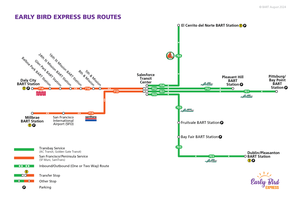 | 703 | Dublin/Pleasanton to Salesforce Transit Center via Bay Fair/Fruitvale | AC Transit | 3:47am @ Dublin 4:04am @ Bay Fair 4:20am @ Fruitvale |