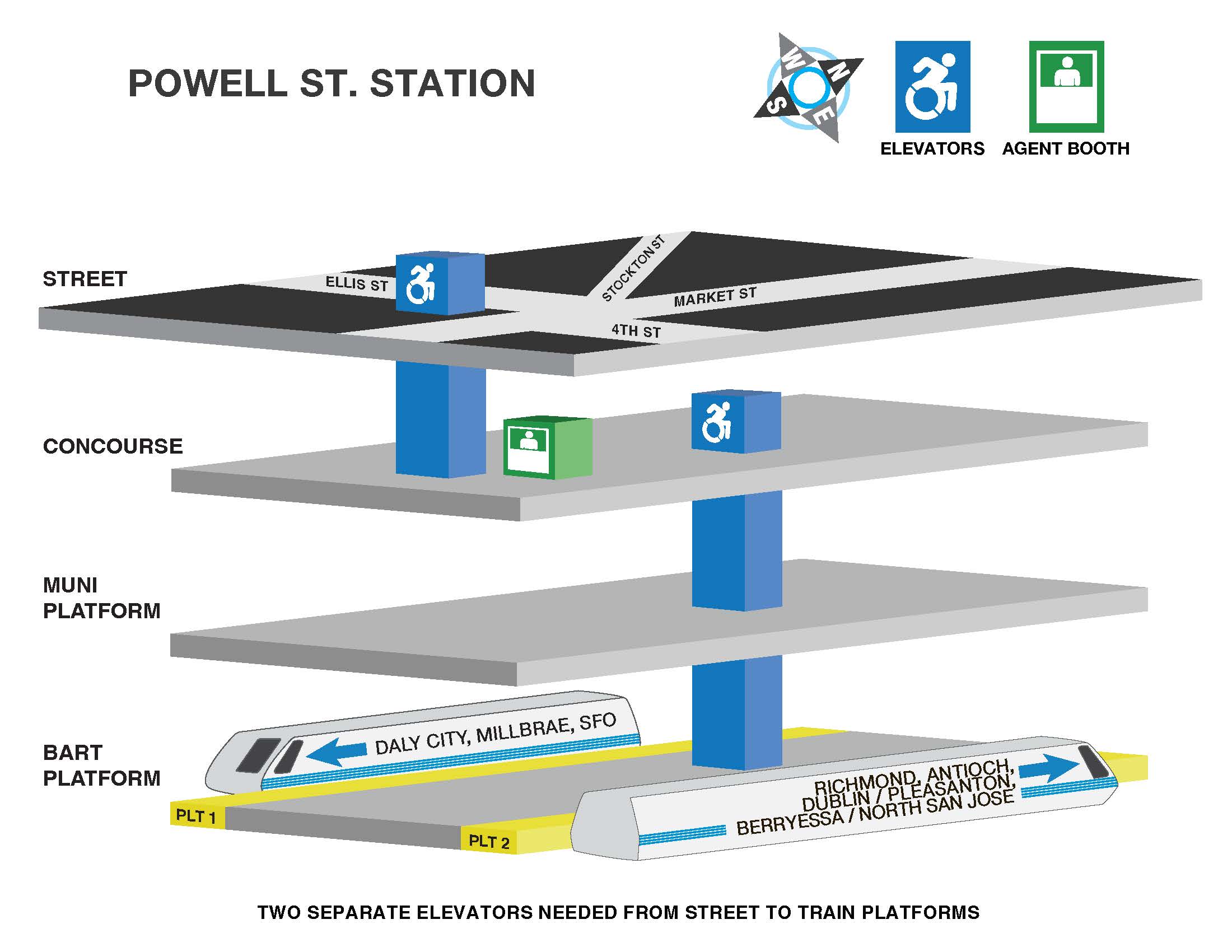 - Take the street elevator (at Ellis Street and Market Street) to access the station concourse.